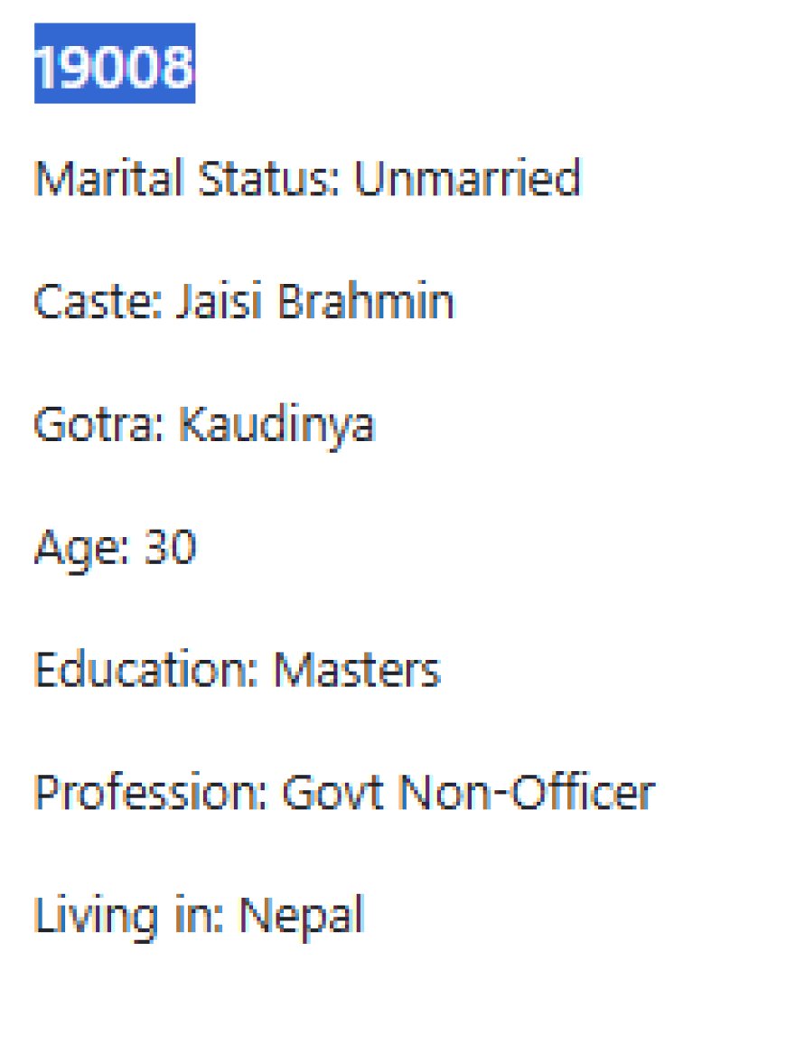 मेरो प्राथमिकता के के हो र मैले कस्तो जीवनसाथी खोजेको भनेर विहेवारीलाई भनेको छु । यदी हजुरहरु उक्त प्राथमिकता भित्र पर्नु हुन्छ भने विहेवारीलाई सम्पर्क गर्नुहोला । उहाँले हाम्रो भेटघाट गराइदिनु होला वा कुरा गराइदिनुहोला । त्यसपछि हामी सिधै कुरा गर्दा हुन्छ ।