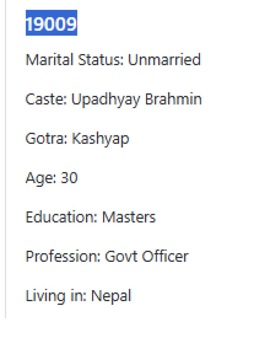 मेरो प्राथमिकता के के हो र मैले कस्तो जीवनसाथी खोजेको भनेर विहेवारीलाई भनेको छु । यदी हजुरहरु उक्त प्राथमिकता भित्र पर्नु हुन्छ भने विहेवारीलाई सम्पर्क गर्नुहोला । उहाँले हाम्रो भेटघाट गराइदिनु होला वा कुरा गराइदिनुहोला । त्यसपछि हामी सिधै कुरा गर्दा हुन्छ ।
