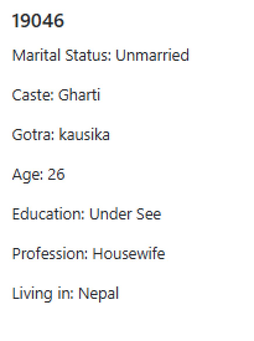 मेरो प्राथमिकता के के हो र मैले कस्तो जीवनसाथी खोजेको भनेर विहेवारीलाई भनेको छु । यदी हजुरहरु उक्त प्राथमिकता भित्र पर्नु हुन्छ भने विहेवारीलाई सम्पर्क गर्नुहोला । उहाँले हाम्रो भेटघाट गराइदिनु होला वा कुरा गराइदिनुहोला । त्यसपछि हामी सिधै कुरा गर्दा हुन्छ ।