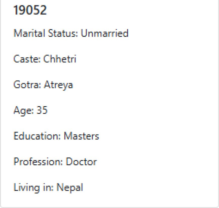 मेरो प्राथमिकता के के हो र मैले कस्तो जीवनसाथी खोजेको भनेर विहेवारीलाई भनेको छु । यदी हजुरहरु उक्त प्राथमिकता भित्र पर्नु हुन्छ भने विहेवारीलाई सम्पर्क गर्नुहोला । उहाँले हाम्रो भेटघाट गराइदिनु होला वा कुरा गराइदिनुहोला । त्यसपछि हामी सिधै कुरा गर्दा हुन्छ ।