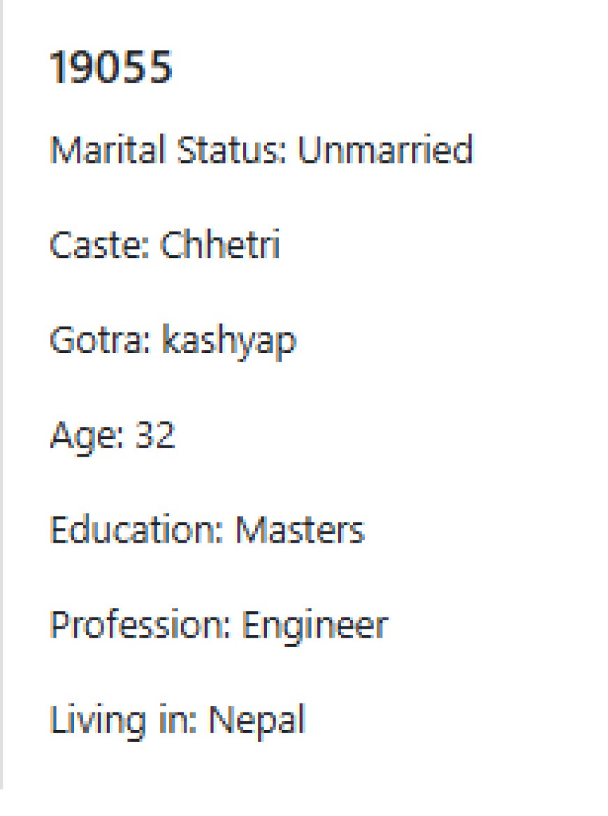 मेरो प्राथमिकता के के हो र मैले कस्तो जीवनसाथी खोजेको भनेर विहेवारीलाई भनेको छु । यदी हजुरहरु उक्त प्राथमिकता भित्र पर्नु हुन्छ भने विहेवारीलाई सम्पर्क गर्नुहोला । उहाँले हाम्रो भेटघाट गराइदिनु होला वा कुरा गराइदिनुहोला । त्यसपछि हामी सिधै कुरा गर्दा हुन्छ ।