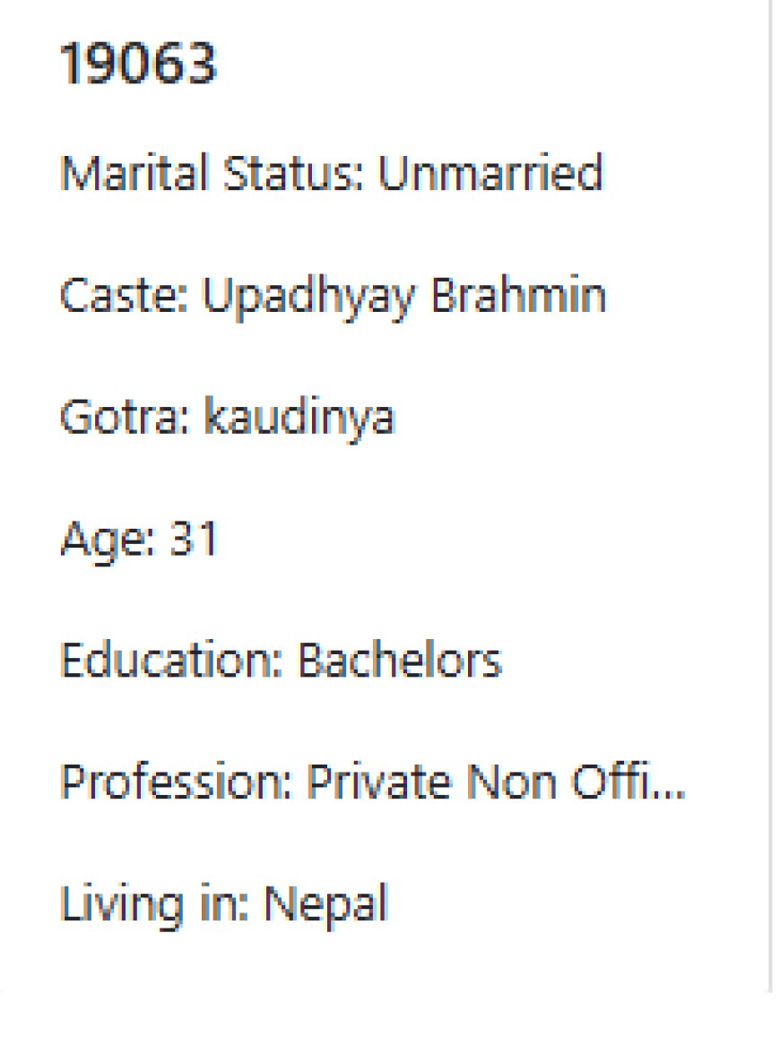 मेरो प्राथमिकता के के हो र मैले कस्तो जीवनसाथी खोजेको भनेर विहेवारीलाई भनेको छु । यदी हजुरहरु उक्त प्राथमिकता भित्र पर्नु हुन्छ भने विहेवारीलाई सम्पर्क गर्नुहोला । उहाँले हाम्रो भेटघाट गराइदिनु होला वा कुरा गराइदिनुहोला । त्यसपछि हामी सिधै कुरा गर्दा हुन्छ ।