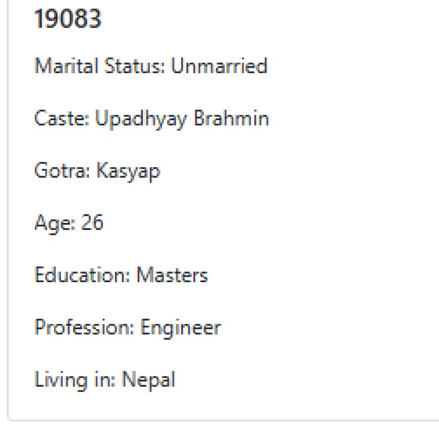 मेरो प्राथमिकता के के हो र मैले कस्तो जीवनसाथी खोजेको भनेर विहेवारीलाई भनेको छु । यदी हजुरहरु उक्त प्राथमिकता भित्र पर्नु हुन्छ भने विहेवारीलाई सम्पर्क गर्नुहोला । उहाँले हाम्रो भेटघाट गराइदिनु होला वा कुरा गराइदिनुहोला । त्यसपछि हामी सिधै कुरा गर्दा हुन्छ ।