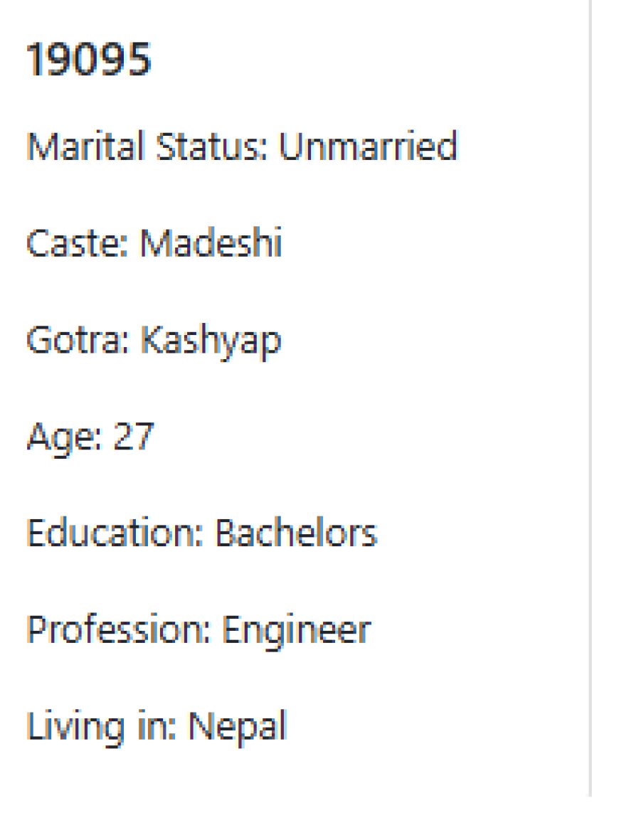 मेरो प्राथमिकता के के हो र मैले कस्तो जीवनसाथी खोजेको भनेर विहेवारीलाई भनेको छु । यदी हजुरहरु उक्त प्राथमिकता भित्र पर्नु हुन्छ भने विहेवारीलाई सम्पर्क गर्नुहोला । उहाँले हाम्रो भेटघाट गराइदिनु होला वा कुरा गराइदिनुहोला । त्यसपछि हामी सिधै कुरा गर्दा हुन्छ ।