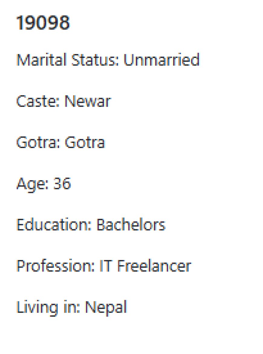 मेरो प्राथमिकता के के हो र मैले कस्तो जीवनसाथी खोजेको भनेर विहेवारीलाई भनेको छु । यदी हजुरहरु उक्त प्राथमिकता भित्र पर्नु हुन्छ भने विहेवारीलाई सम्पर्क गर्नुहोला । उहाँले हाम्रो भेटघाट गराइदिनु होला वा कुरा गराइदिनुहोला । त्यसपछि हामी सिधै कुरा गर्दा हुन्छ ।