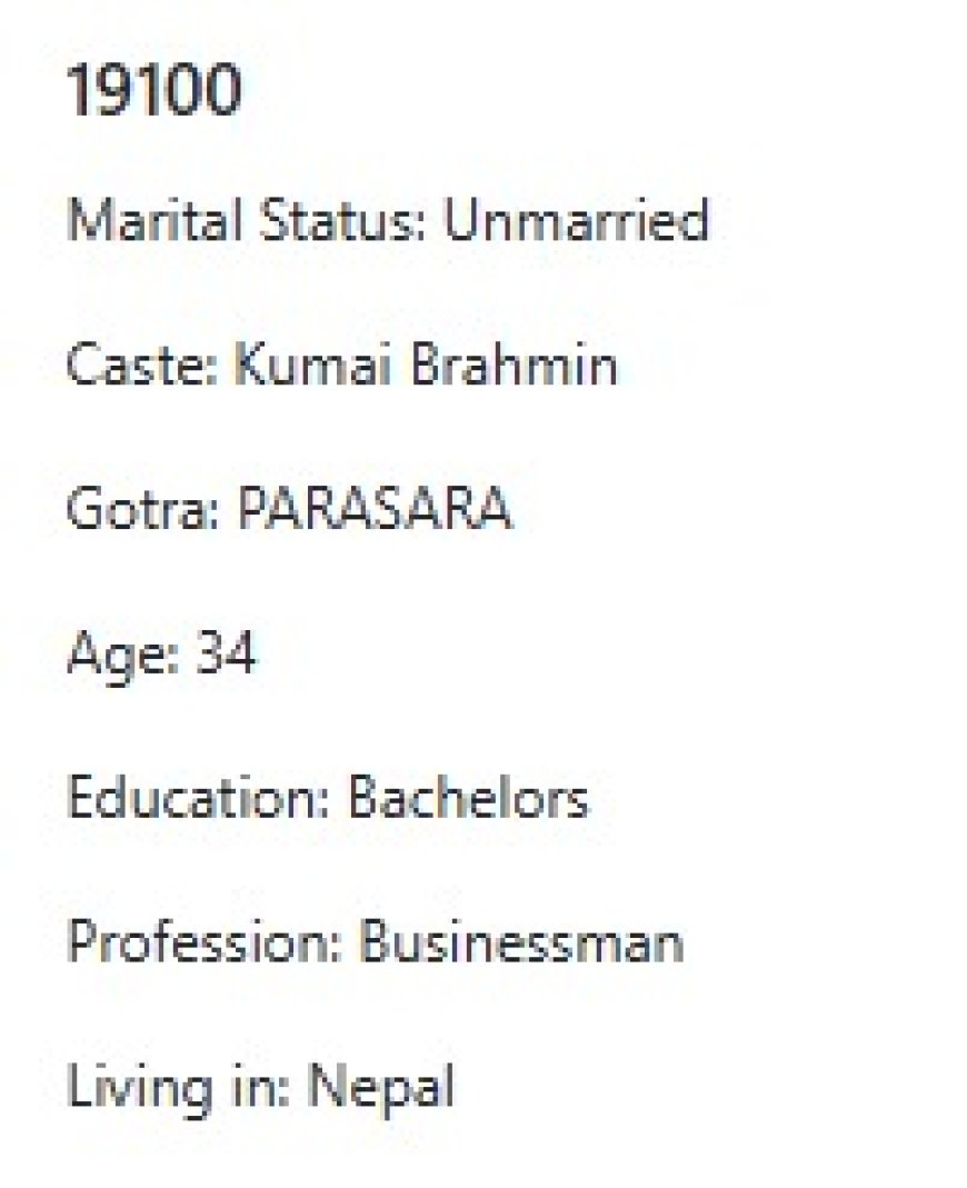 मेरो प्राथमिकता के के हो र मैले कस्तो जीवनसाथी खोजेको भनेर विहेवारीलाई भनेको छु । यदी हजुरहरु उक्त प्राथमिकता भित्र पर्नु हुन्छ भने विहेवारीलाई सम्पर्क गर्नुहोला । उहाँले हाम्रो भेटघाट गराइदिनु होला वा कुरा गराइदिनुहोला । त्यसपछि हामी सिधै कुरा गर्दा हुन्छ ।
