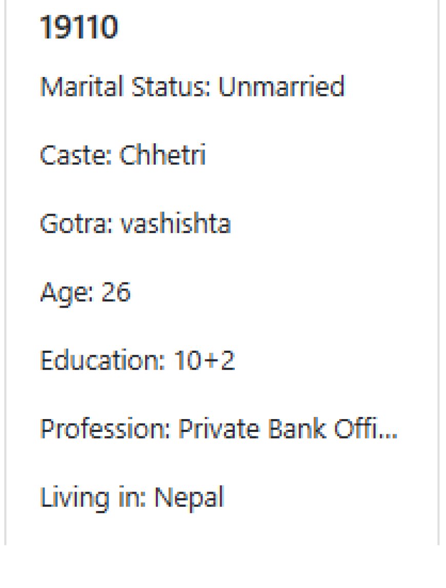 मेरो प्राथमिकता के के हो र मैले कस्तो जीवनसाथी खोजेको भनेर विहेवारीलाई भनेको छु । यदी हजुरहरु उक्त प्राथमिकता भित्र पर्नु हुन्छ भने विहेवारीलाई सम्पर्क गर्नुहोला । उहाँले हाम्रो भेटघाट गराइदिनु होला वा कुरा गराइदिनुहोला । त्यसपछि हामी सिधै कुरा गर्दा हुन्छ ।