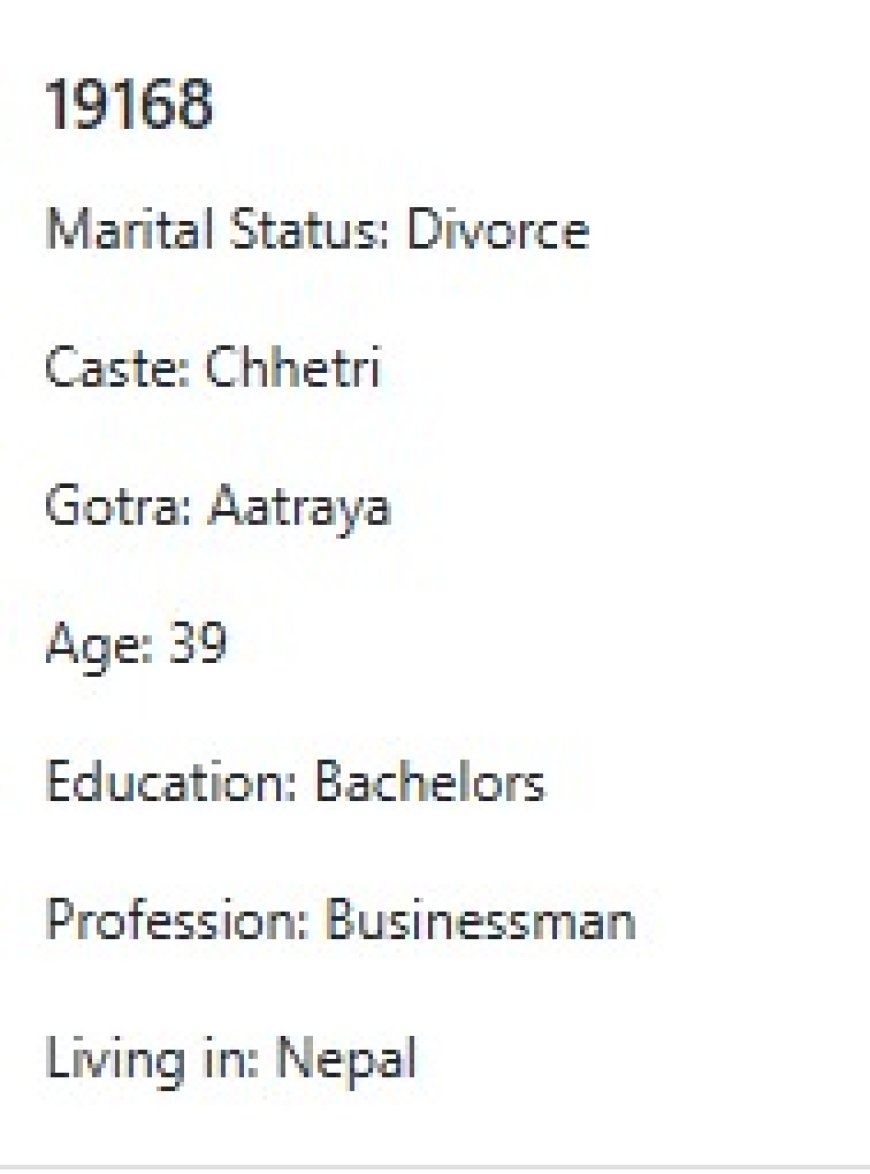 मेरो प्राथमिकता के के हो र मैले कस्तो जीवनसाथी खोजेको भनेर विहेवारीलाई भनेको छु । यदी हजुरहरु उक्त प्राथमिकता भित्र पर्नु हुन्छ भने विहेवारीलाई सम्पर्क गर्नुहोला । उहाँले हाम्रो भेटघाट गराइदिनु होला वा कुरा गराइदिनुहोला । त्यसपछि हामी सिधै कुरा गर्दा हुन्छ ।