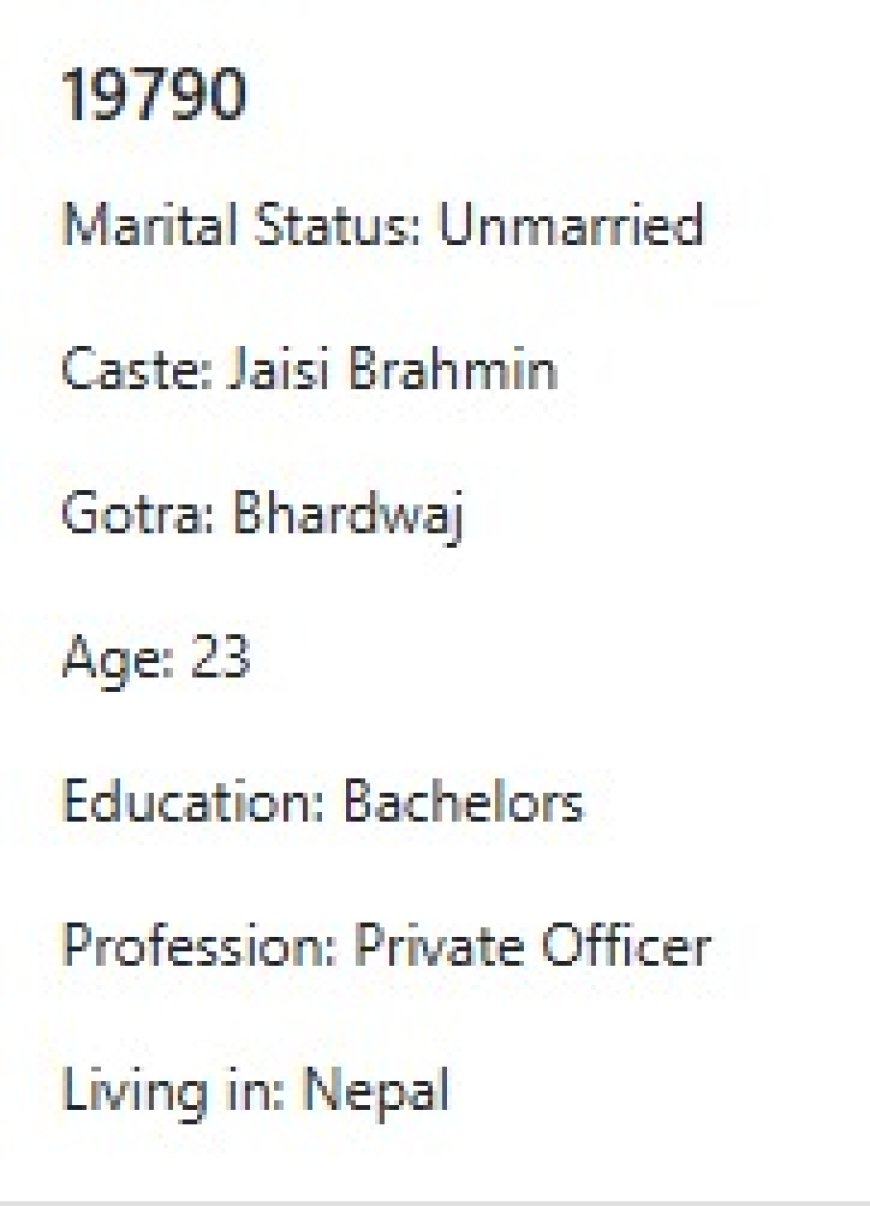 मेरो प्राथमिकता के के हो र मैले कस्तो जीवनसाथी खोजेको भनेर विहेवारीलाई भनेको छु । यदी हजुरहरु उक्त प्राथमिकता भित्र पर्नु हुन्छ भने विहेवारीलाई सम्पर्क गर्नुहोला । उहाँले हाम्रो भेटघाट गराइदिनु होला वा कुरा गराइदिनुहोला । त्यसपछि हामी सिधै कुरा गर्दा हुन्छ ।