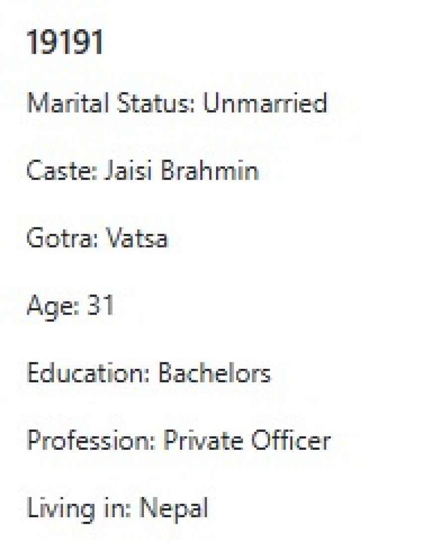 मेरो प्राथमिकता के के हो र मैले कस्तो जीवनसाथी खोजेको भनेर विहेवारीलाई भनेको छु । यदी हजुरहरु उक्त प्राथमिकता भित्र पर्नु हुन्छ भने विहेवारीलाई सम्पर्क गर्नुहोला । उहाँले हाम्रो भेटघाट गराइदिनु होला वा कुरा गराइदिनुहोला । त्यसपछि हामी सिधै कुरा गर्दा हुन्छ ।