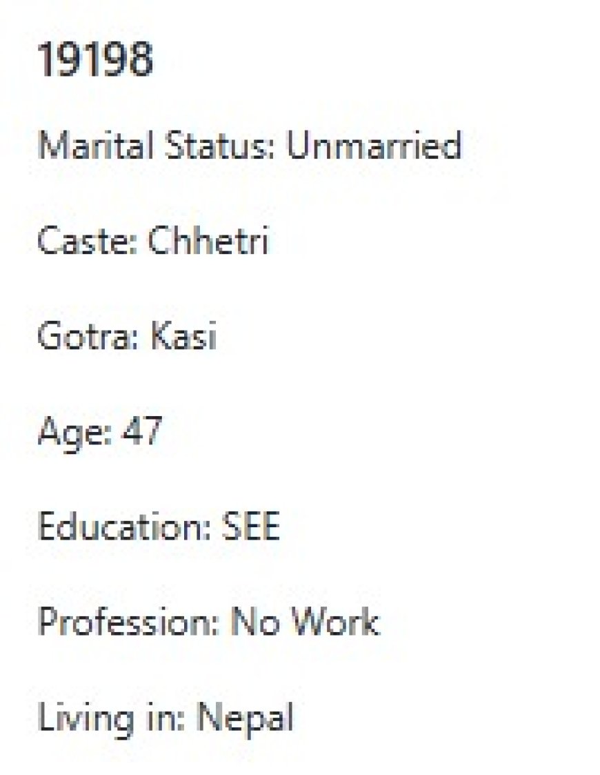 मेरो प्राथमिकता के के हो र मैले कस्तो जीवनसाथी खोजेको भनेर विहेवारीलाई भनेको छु । यदी हजुरहरु उक्त प्राथमिकता भित्र पर्नु हुन्छ भने विहेवारीलाई सम्पर्क गर्नुहोला । उहाँले हाम्रो भेटघाट गराइदिनु होला वा कुरा गराइदिनुहोला । त्यसपछि हामी सिधै कुरा गर्दा हुन्छ ।