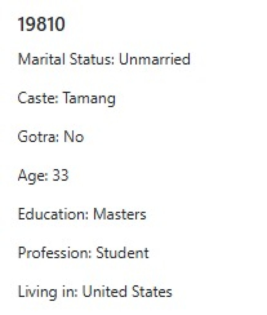 मेरो प्राथमिकता के के हो र मैले कस्तो जीवनसाथी खोजेको भनेर विहेवारीलाई भनेको छु । यदी हजुरहरु उक्त प्राथमिकता भित्र पर्नु हुन्छ भने विहेवारीलाई सम्पर्क गर्नुहोला । उहाँले हाम्रो भेटघाट गराइदिनु होला वा कुरा गराइदिनुहोला । त्यसपछि हामी सिधै कुरा गर्दा हुन्छ ।