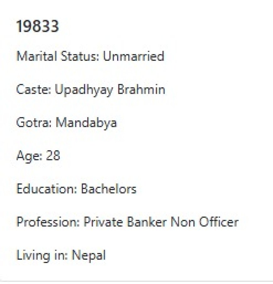 मेरो प्राथमिकता के के हो र मैले कस्तो जीवनसाथी खोजेको भनेर विहेवारीलाई भनेको छु । यदी हजुरहरु उक्त प्राथमिकता भित्र पर्नु हुन्छ भने विहेवारीलाई सम्पर्क गर्नुहोला । उहाँले हाम्रो भेटघाट गराइदिनु होला वा कुरा गराइदिनुहोला । त्यसपछि हामी सिधै कुरा गर्दा हुन्छ ।