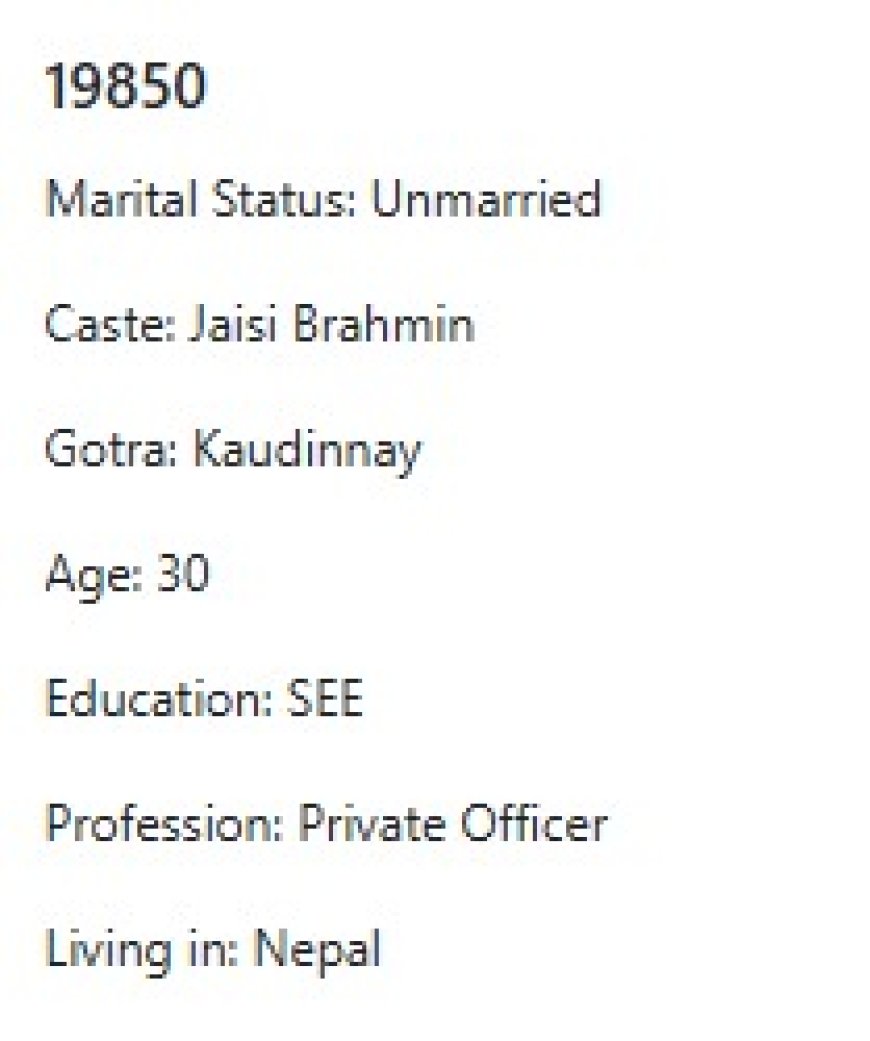 मेरो प्राथमिकता के के हो र मैले कस्तो जीवनसाथी खोजेको भनेर विहेवारीलाई भनेको छु । यदी हजुरहरु उक्त प्राथमिकता भित्र पर्नु हुन्छ भने विहेवारीलाई सम्पर्क गर्नुहोला । उहाँले हाम्रो भेटघाट गराइदिनु होला वा कुरा गराइदिनुहोला । त्यसपछि हामी सिधै कुरा गर्दा हुन्छ ।