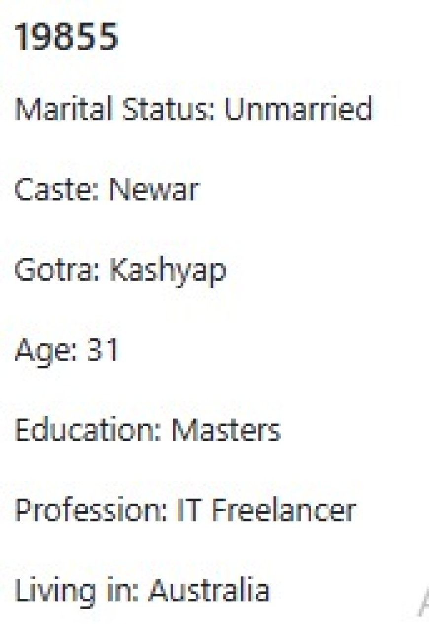 मेरो प्राथमिकता के के हो र मैले कस्तो जीवनसाथी खोजेको भनेर विहेवारीलाई भनेको छु । यदी हजुरहरु उक्त प्राथमिकता भित्र पर्नु हुन्छ भने विहेवारीलाई सम्पर्क गर्नुहोला । उहाँले हाम्रो भेटघाट गराइदिनु होला वा कुरा गराइदिनुहोला । त्यसपछि हामी सिधै कुरा गर्दा हुन्छ ।