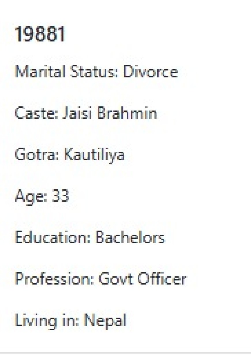मेरो प्राथमिकता के के हो र मैले कस्तो जीवनसाथी खोजेको भनेर विहेवारीलाई भनेको छु । यदी हजुरहरु उक्त प्राथमिकता भित्र पर्नु हुन्छ भने विहेवारीलाई सम्पर्क गर्नुहोला । उहाँले हाम्रो भेटघाट गराइदिनु होला वा कुरा गराइदिनुहोला । त्यसपछि हामी सिधै कुरा गर्दा हुन्छ ।