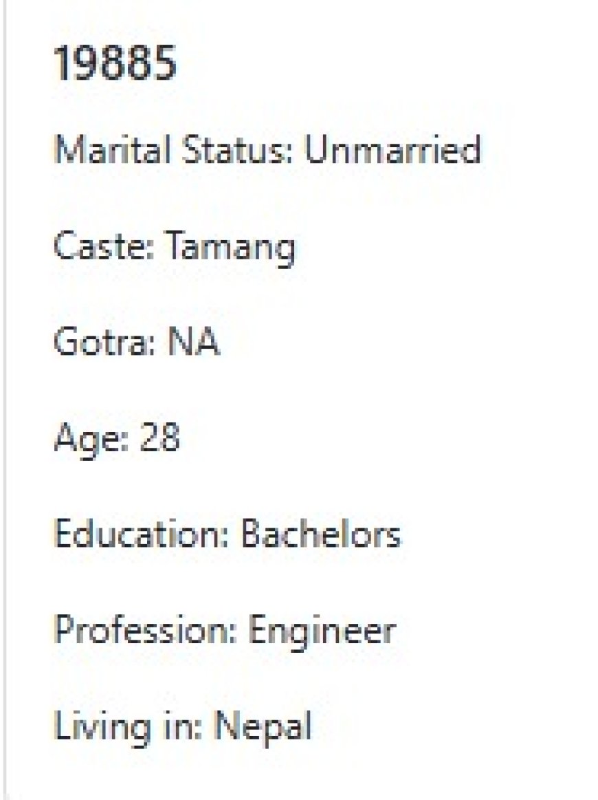 मेरो प्राथमिकता के के हो र मैले कस्तो जीवनसाथी खोजेको भनेर विहेवारीलाई भनेको छु । यदी हजुरहरु उक्त प्राथमिकता भित्र पर्नु हुन्छ भने विहेवारीलाई सम्पर्क गर्नुहोला । उहाँले हाम्रो भेटघाट गराइदिनु होला वा कुरा गराइदिनुहोला । त्यसपछि हामी सिधै कुरा गर्दा हुन्छ ।