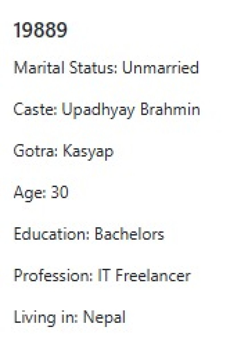 मेरो प्राथमिकता के के हो र मैले कस्तो जीवनसाथी खोजेको भनेर विहेवारीलाई भनेको छु । यदी हजुरहरु उक्त प्राथमिकता भित्र पर्नु हुन्छ भने विहेवारीलाई सम्पर्क गर्नुहोला । उहाँले हाम्रो भेटघाट गराइदिनु होला वा कुरा गराइदिनुहोला । त्यसपछि हामी सिधै कुरा गर्दा हुन्छ ।