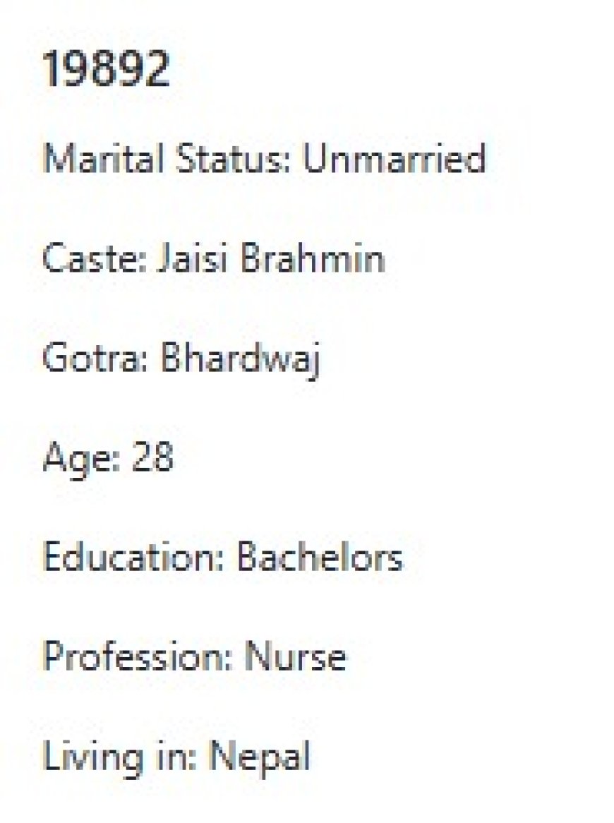 मेरो प्राथमिकता के के हो र मैले कस्तो जीवनसाथी खोजेको भनेर विहेवारीलाई भनेको छु । यदी हजुरहरु उक्त प्राथमिकता भित्र पर्नु हुन्छ भने विहेवारीलाई सम्पर्क गर्नुहोला । उहाँले हाम्रो भेटघाट गराइदिनु होला वा कुरा गराइदिनुहोला । त्यसपछि हामी सिधै कुरा गर्दा हुन्छ ।
