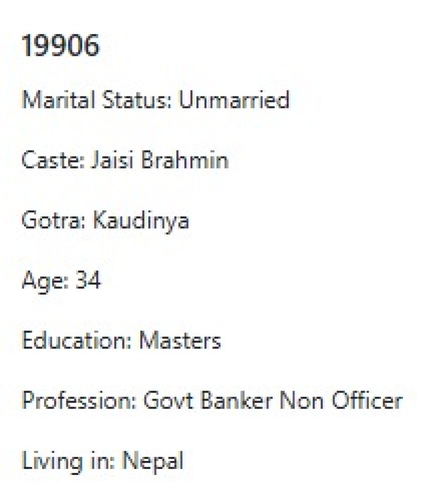 मेरो प्राथमिकता के के हो र मैले कस्तो जीवनसाथी खोजेको भनेर विहेवारीलाई भनेको छु । यदी हजुरहरु उक्त प्राथमिकता भित्र पर्नु हुन्छ भने विहेवारीलाई सम्पर्क गर्नुहोला । उहाँले हाम्रो भेटघाट गराइदिनु होला वा कुरा गराइदिनुहोला । त्यसपछि हामी सिधै कुरा गर्दा हुन्छ ।