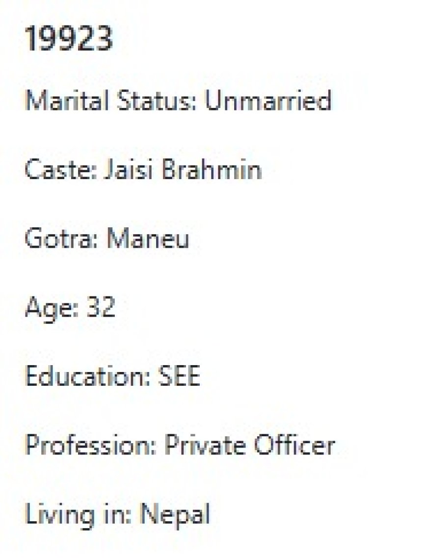 मेरो प्राथमिकता के के हो र मैले कस्तो जीवनसाथी खोजेको भनेर विहेवारीलाई भनेको छु । यदी हजुरहरु उक्त प्राथमिकता भित्र पर्नु हुन्छ भने विहेवारीलाई सम्पर्क गर्नुहोला । उहाँले हाम्रो भेटघाट गराइदिनु होला वा कुरा गराइदिनुहोला । त्यसपछि हामी सिधै कुरा गर्दा हुन्छ ।
