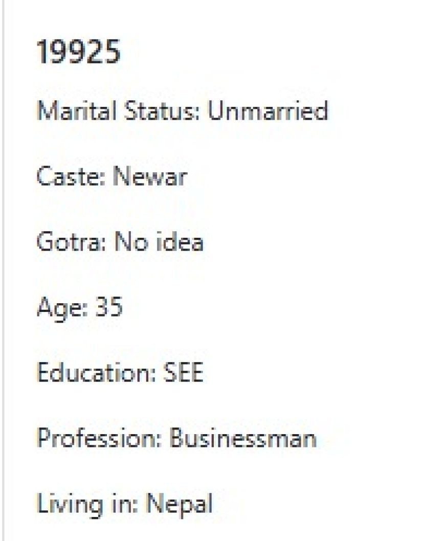 मेरो प्राथमिकता के के हो र मैले कस्तो जीवनसाथी खोजेको भनेर विहेवारीलाई भनेको छु । यदी हजुरहरु उक्त प्राथमिकता भित्र पर्नु हुन्छ भने विहेवारीलाई सम्पर्क गर्नुहोला । उहाँले हाम्रो भेटघाट गराइदिनु होला वा कुरा गराइदिनुहोला । त्यसपछि हामी सिधै कुरा गर्दा हुन्छ ।