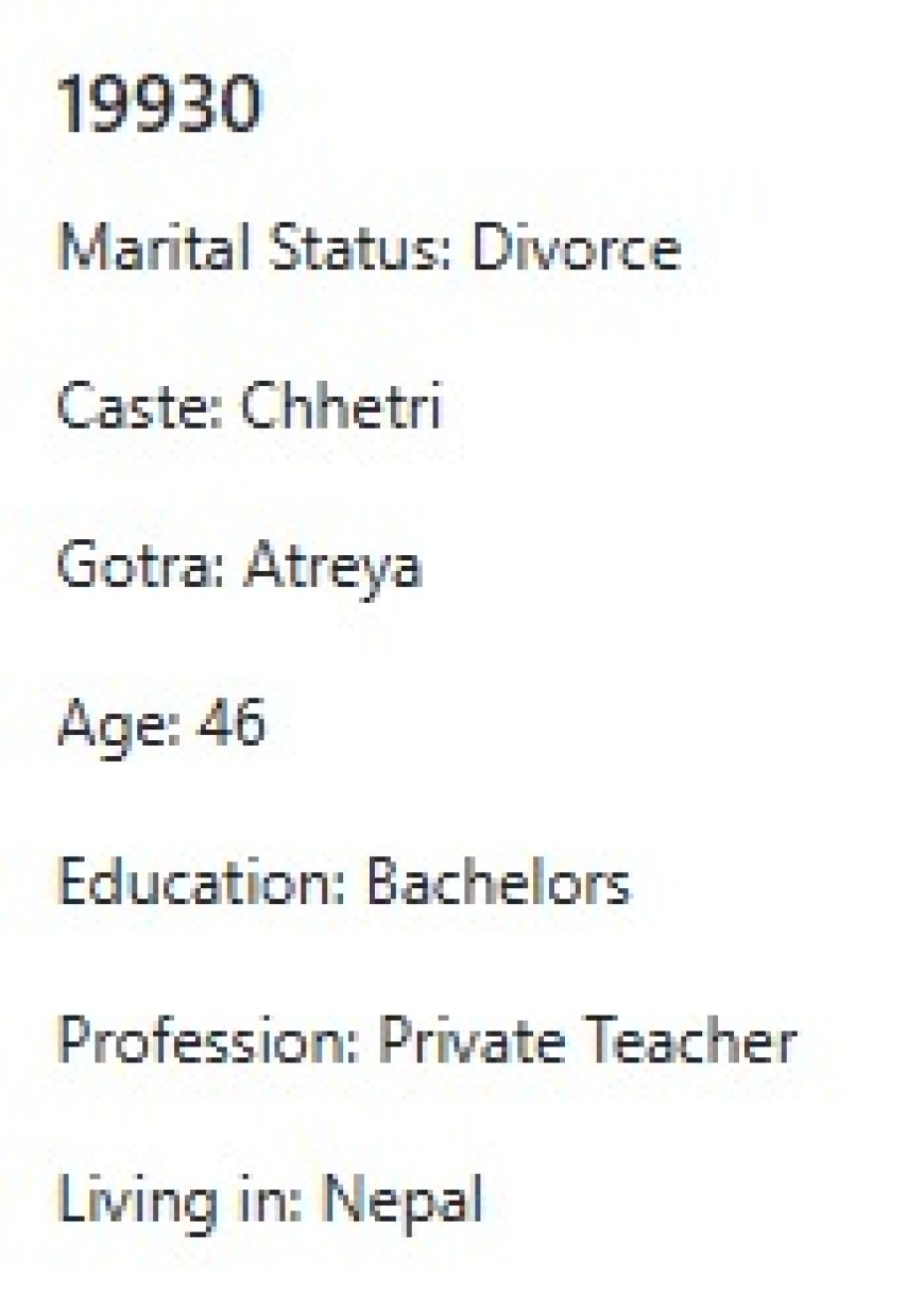 मेरो प्राथमिकता के के हो र मैले कस्तो जीवनसाथी खोजेको भनेर विहेवारीलाई भनेको छु । यदी हजुरहरु उक्त प्राथमिकता भित्र पर्नु हुन्छ भने विहेवारीलाई सम्पर्क गर्नुहोला । उहाँले हाम्रो भेटघाट गराइदिनु होला वा कुरा गराइदिनुहोला । त्यसपछि हामी सिधै कुरा गर्दा हुन्छ ।