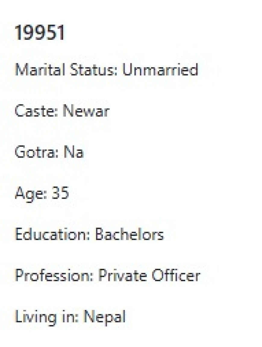 मेरो प्राथमिकता के के हो र मैले कस्तो जीवनसाथी खोजेको भनेर विहेवारीलाई भनेको छु । यदी हजुरहरु उक्त प्राथमिकता भित्र पर्नु हुन्छ भने विहेवारीलाई सम्पर्क गर्नुहोला । उहाँले हाम्रो भेटघाट गराइदिनु होला वा कुरा गराइदिनुहोला । त्यसपछि हामी सिधै कुरा गर्दा हुन्छ ।