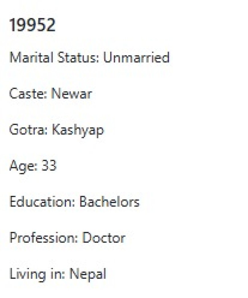 मेरो प्राथमिकता के के हो र मैले कस्तो जीवनसाथी खोजेको भनेर विहेवारीलाई भनेको छु । यदी हजुरहरु उक्त प्राथमिकता भित्र पर्नु हुन्छ भने विहेवारीलाई सम्पर्क गर्नुहोला । उहाँले हाम्रो भेटघाट गराइदिनु होला वा कुरा गराइदिनुहोला । त्यसपछि हामी सिधै कुरा गर्दा हुन्छ ।