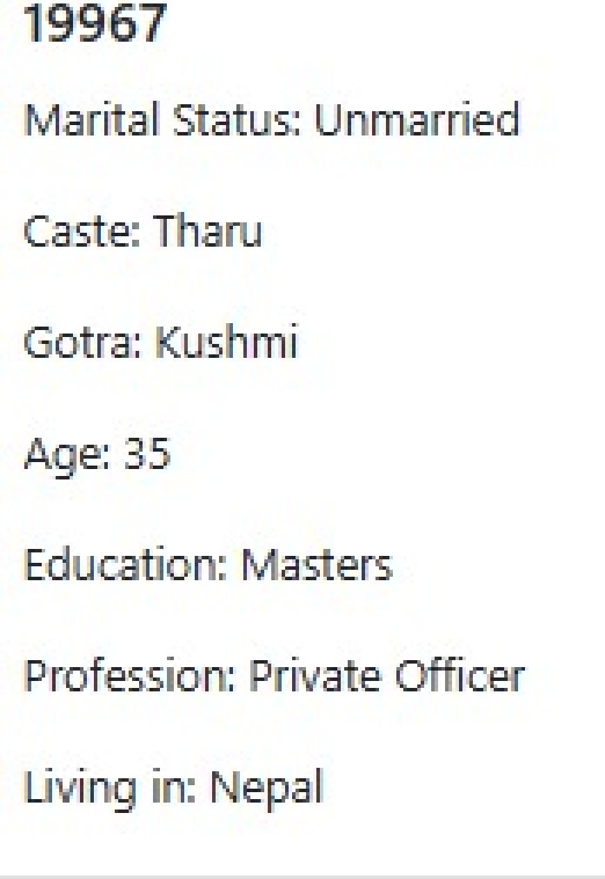मेरो प्राथमिकता के के हो र मैले कस्तो जीवनसाथी खोजेको भनेर विहेवारीलाई भनेको छु । यदी हजुरहरु उक्त प्राथमिकता भित्र पर्नु हुन्छ भने विहेवारीलाई सम्पर्क गर्नुहोला । उहाँले हाम्रो भेटघाट गराइदिनु होला वा कुरा गराइदिनुहोला । त्यसपछि हामी सिधै कुरा गर्दा हुन्छ ।