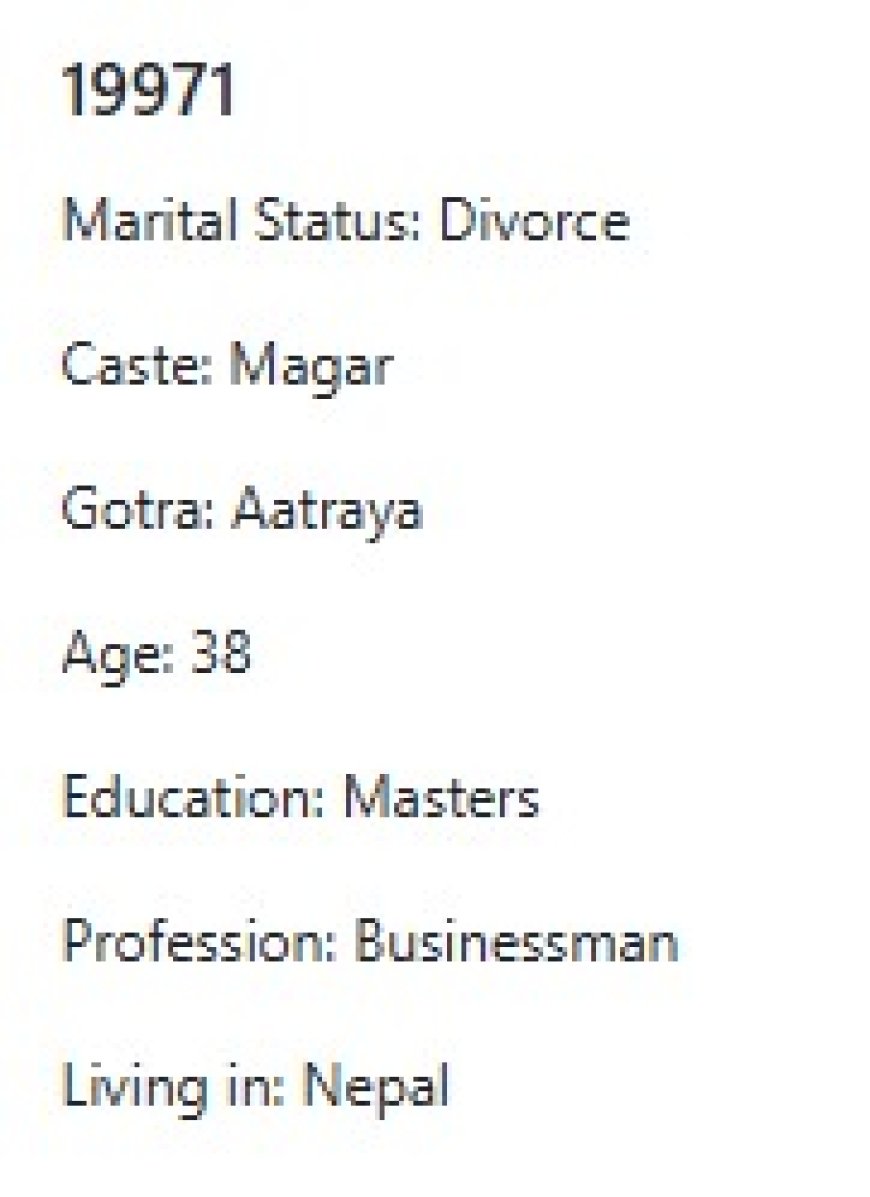 मेरो प्राथमिकता के के हो र मैले कस्तो जीवनसाथी खोजेको भनेर विहेवारीलाई भनेको छु । यदी हजुरहरु उक्त प्राथमिकता भित्र पर्नु हुन्छ भने विहेवारीलाई सम्पर्क गर्नुहोला । उहाँले हाम्रो भेटघाट गराइदिनु होला वा कुरा गराइदिनुहोला । त्यसपछि हामी सिधै कुरा गर्दा हुन्छ ।