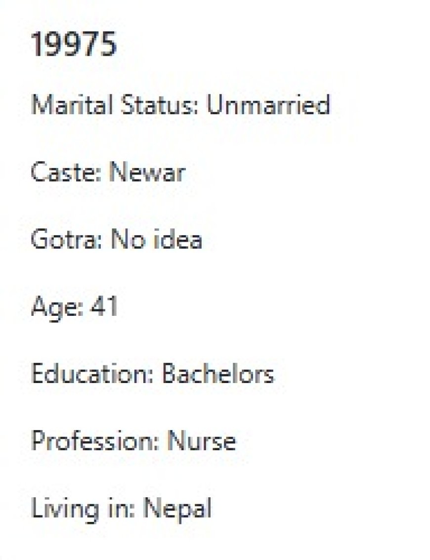 मेरो प्राथमिकता के के हो र मैले कस्तो जीवनसाथी खोजेको भनेर विहेवारीलाई भनेको छु । यदी हजुरहरु उक्त प्राथमिकता भित्र पर्नु हुन्छ भने विहेवारीलाई सम्पर्क गर्नुहोला । उहाँले हाम्रो भेटघाट गराइदिनु होला वा कुरा गराइदिनुहोला । त्यसपछि हामी सिधै कुरा गर्दा हुन्छ ।